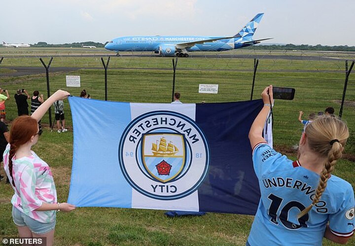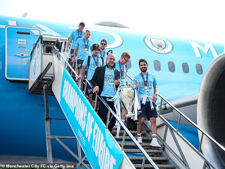 Man City's treble winners have returned to Manchester airport after their Champions League final win over Inter Milan in Istanbul.