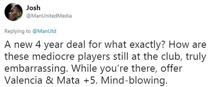 Some went a little further with their damning assessment of the news with one posting: 'A new four year deal for what exactly? How are these mediocre players still at the club, truly embarrassing.'