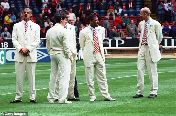 However, it was their opponents who stole the headlines, after the Reds' squad - who were nicknamed 'the Spice Boys' - rocked up in cream-coloured Armani suits, outlandish striped ties and white Gucci shoes.