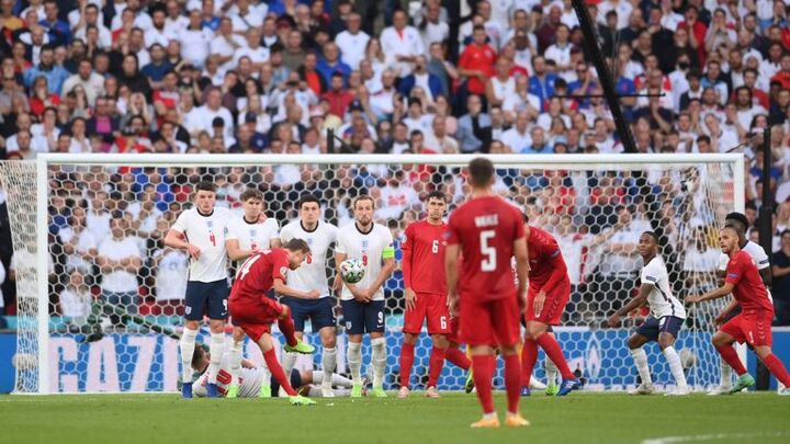 Before it was taken, centre-backs Andreas Christensen, Simon Kjaer and Jannik Vestergaard, three of Denmark's tallest players, formed their own wall a few yards to the left of England's.