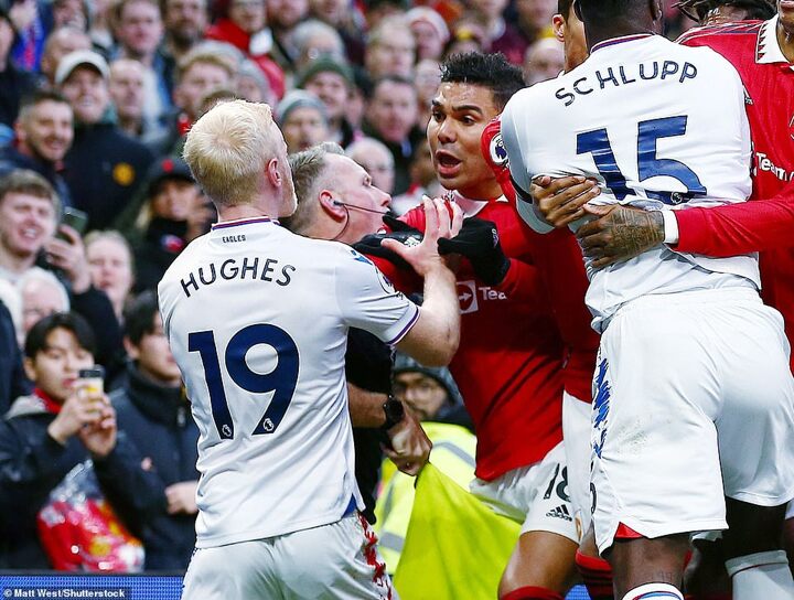 Casemiro was first on the scene to defend his compatriot as he pushed Schlupp in the chest, and Antony sprang off the floor to barge him as well. The rest of the players steamed as tempers boiled over and a 20-man melee threatened to get completely out of hand.