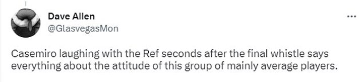 One said: 'Casemiro laughing with the Ref seconds after the final whistle says everything about the attitude of this group of mainly average players.'