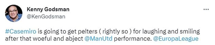 Another added: 'Casemiro is going to get pelters ( rightly so ) for laughing and smiling after that woeful and abject @ManUtd performance.'