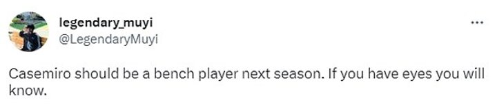 A further angry supporter quipped: 'Casemiro should be a bench player next season. If you have eyes you will know.'