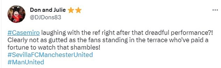 A further supporter said: 'Casemiro laughing with the ref right after that dreadful performance?! Clearly not as gutted as the fans standing in the terrace who've paid a fortune to watch that shambles!'