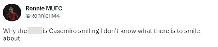 United fans noticed this and fumed as one angry fan said: 'Why the f*** is Casemiro smiling I don’t know what there is to smile about.'