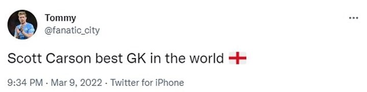 Manchester City fan Tommy posted: 'Scott Carson best GK in the world.'