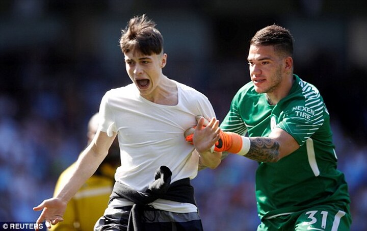 City supporters invaded the pitch during and after the match, with the goalkeeper playing his part in helping security restore order.