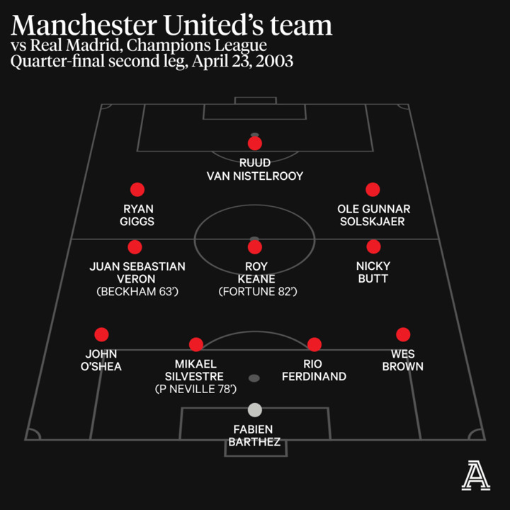 United responded quickly this time, Veron's shot being unwittingly deflected in by Ivan Helguera. The aggregate score was now 5-3, but Real had two away goals, so the now-scrapped away-goals rule meant they would proceed to the semi-finals unless United got at least another three.
