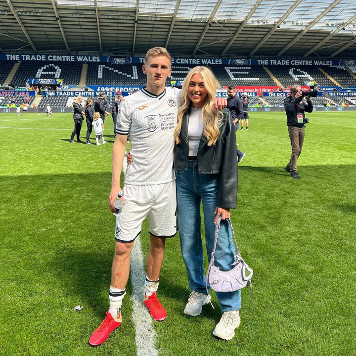 She joined the 23-year-old midfielder on the pitch at The Swansea.com Stadium to celebrate the end of the Championship season.