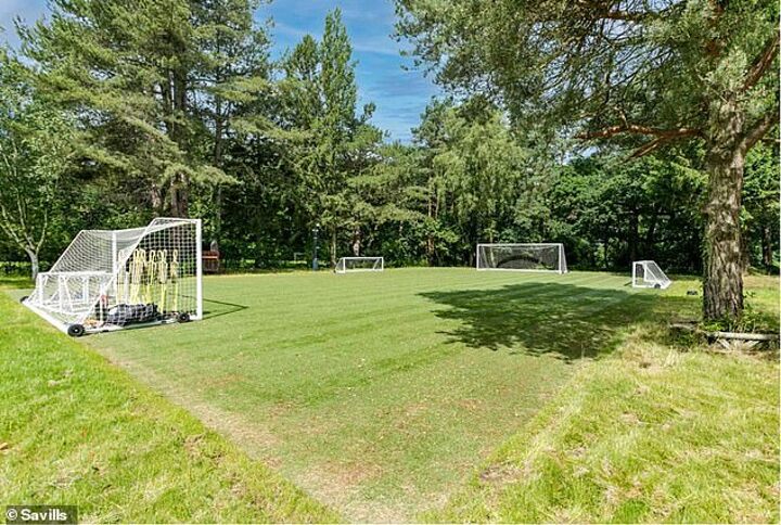 The garden includes a 'sports pitch, basketball area, extensive terraces and an outside kitchen/entertaining area'.