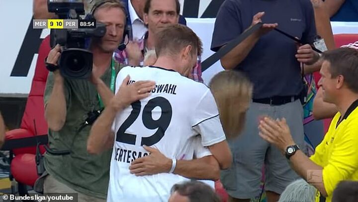 As the game reached the 89-minute mark, the 34-year-old left the pitch before being replaced by his father, leaving Mertesacker in tears.