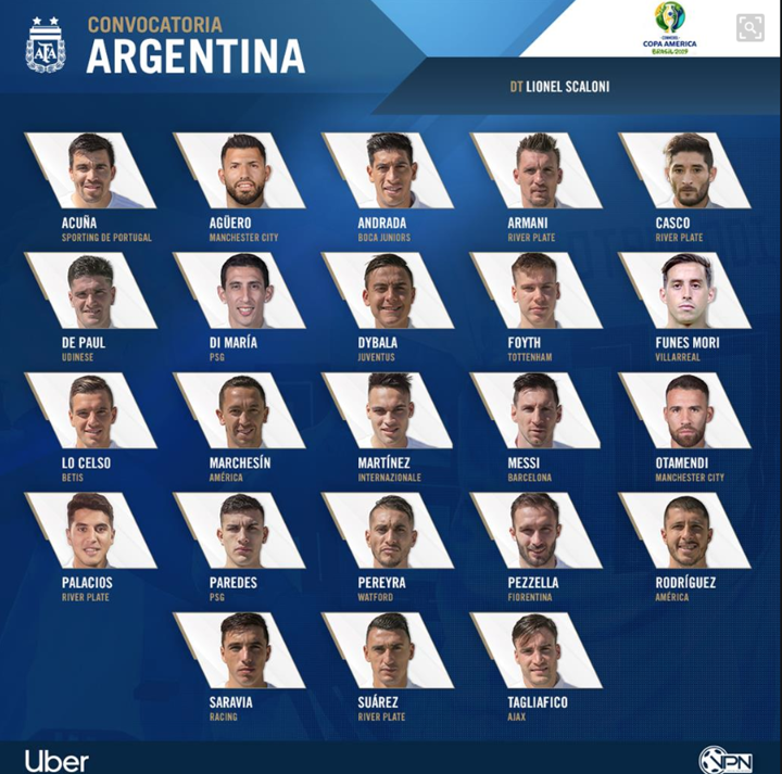 Other notable call-ups include Esteban Andrada (Boca), Franco Armani (River), Paulo Dybala (Juventus), Ángel Di María (PSG), Nicolás Otamendi (Manchester City) and Exequiel Palacios (River).