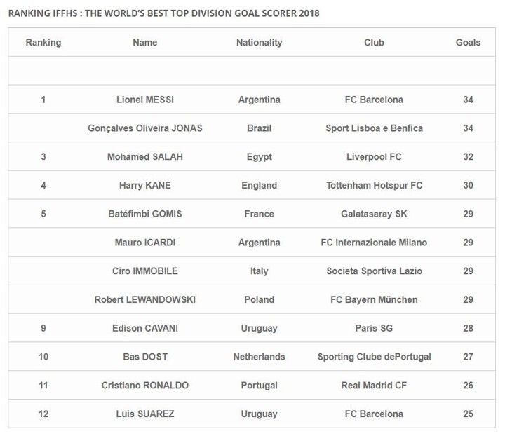 After 2012, 2013 and 2017, Lionel Messi has won his fourth Award of The World’s Best Top Division Goal Scorer 2018 thanks to the 34 goals scored for FC Barcelona, but not alone because the Brazilian Gonçalves Oilveira Jonas scored the same number of goals (34) with Sport Lisboa e Benfica and so won also the Award with Messi.