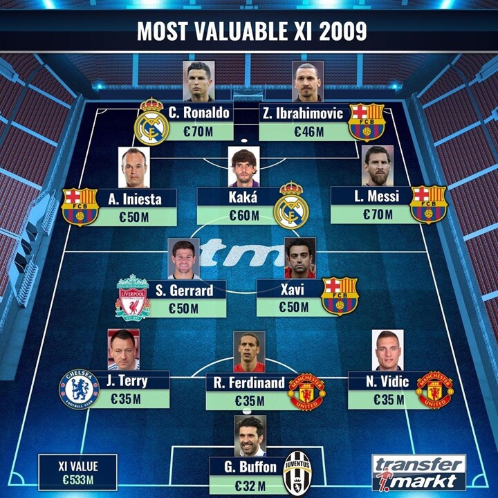 Messi and Ronaldo lead the most valuable XI in 2009 with €70m. Kaka follows with €60m. 4 Barca players are in the squad.