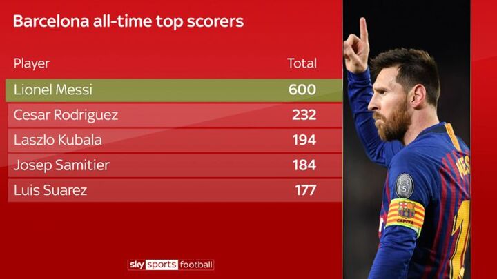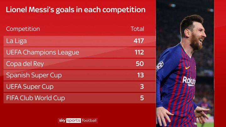 Messi has also scored in six different competitions for Barcelona, becoming the all-time top-scorer in La Liga and the Spanish Super Cup. He is also the second highest scorer in Champions League history with 112 goals, only surpassed by Cristiano Ronaldo with 126.