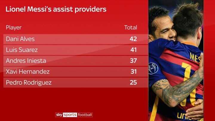 Three of the five players to have provided Messi with the most assists actually played alongside him in Barca's reserve team. His current team-mate Luis Suarez is just one goal away from overtaking Dani Alves as the player to have provided the most assists for him.