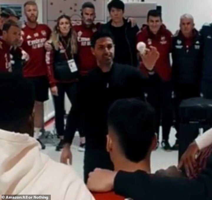 A clearly pumped-up Arteta then finishes with a flourish, embracing goalkeeper Aaron Ramsdale as the players roar and clap with anticipation.
