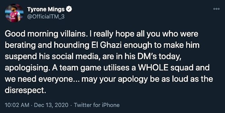 However, after the match Mings took to social media to ask Villa fans to apologise to the match-winner after 'berating and hounding' him online.