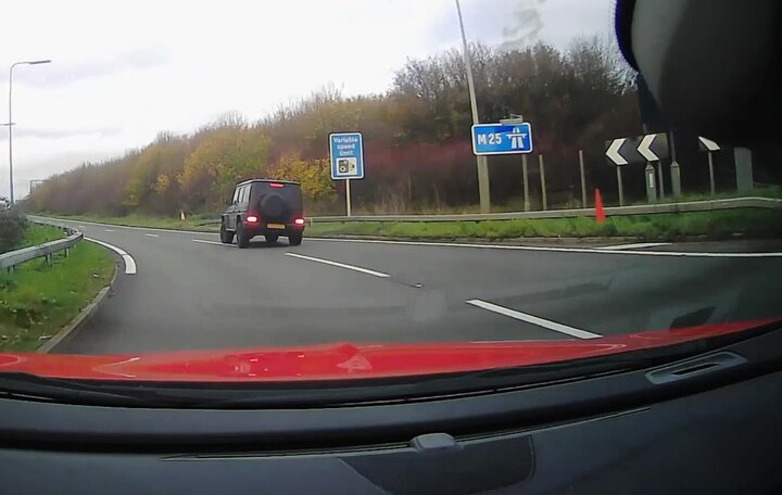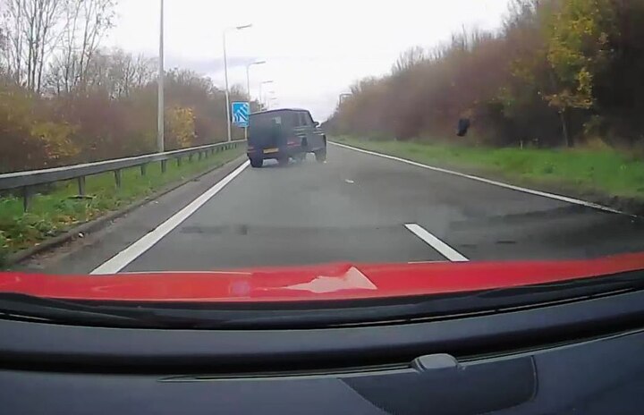 Another driver's dashcam caught this dramatic footage as Willock's car careered across the road, then hit the end of a crash barrier as he lost control of the 2.5 ton, 600bhp beast, sending his rear wheel spinning off up the slip road.