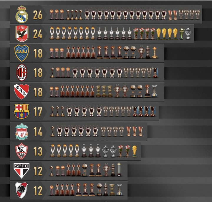 13-time Champions League winners Real Madrid are ahead of Al Ahly, Boca Juniors and co with 26 international trophies.