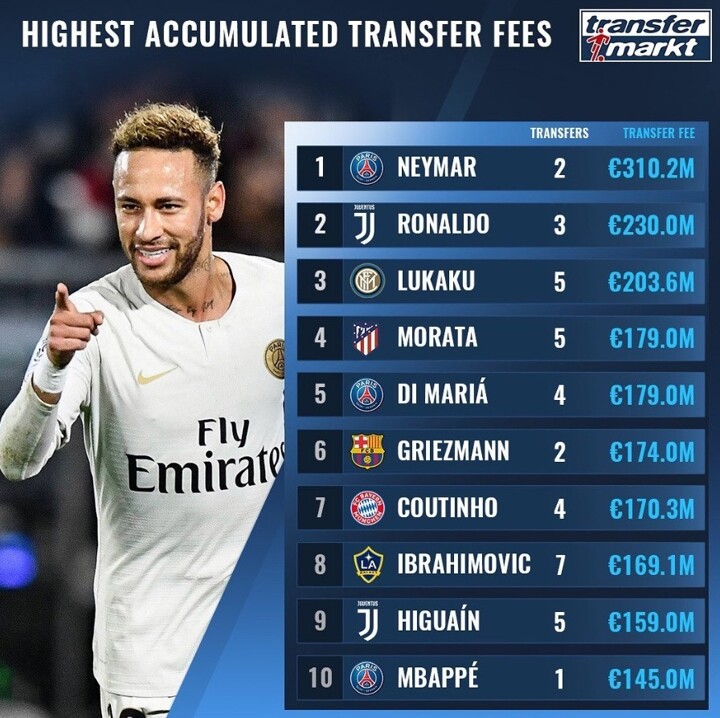 Mbappe is currently on the 10th spot, but a promising future #1 on this chart since Neymar's rumor with Barca is on and off.