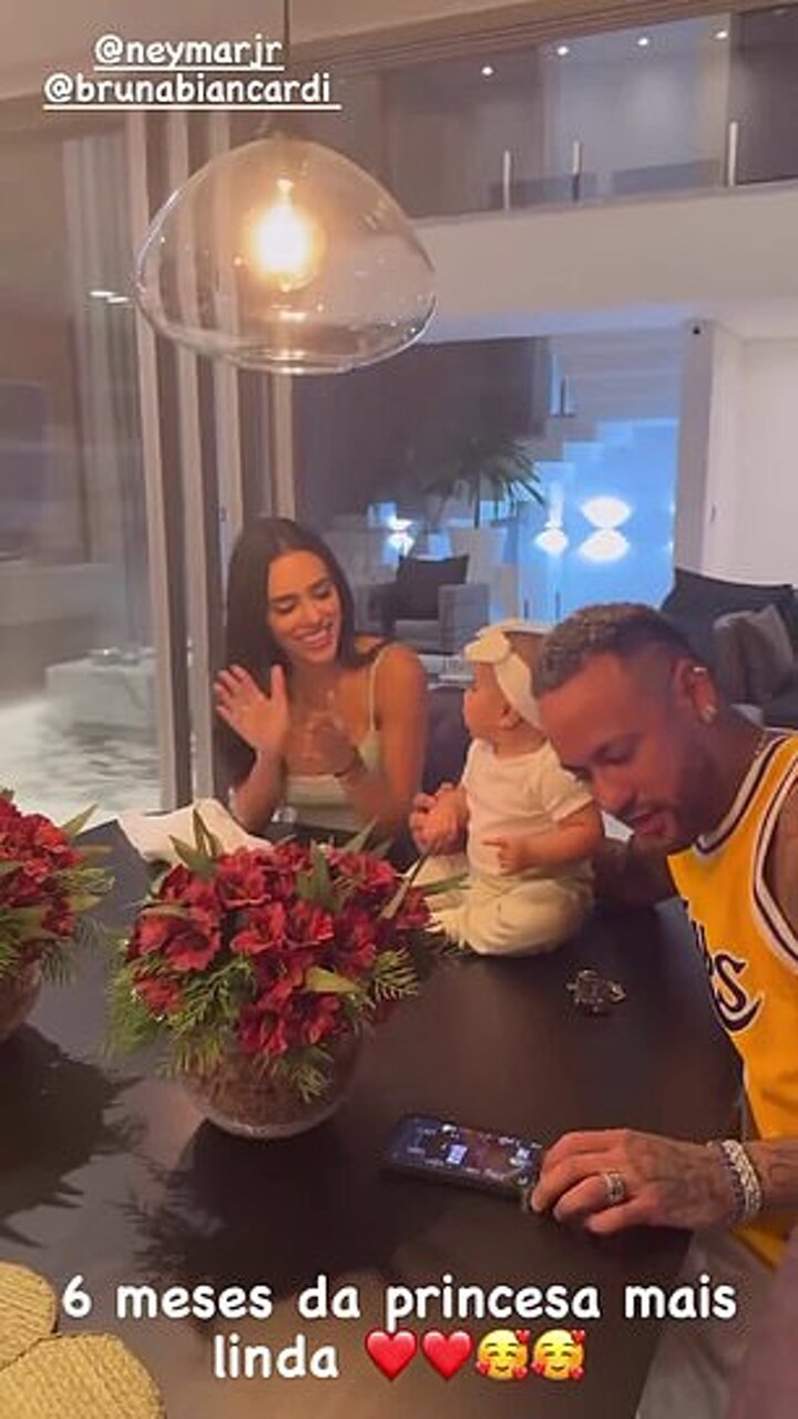 In the video, Neymar and Biancardi were seen holding Mavie, who was perched on a table, alongside the caption: 'Six months of the most beautiful princess.'