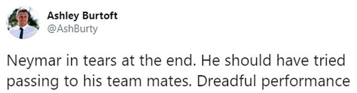 One fan said: 'Neymar in tears at the end. He should have tried passing to his team mates. Dreadful performance'