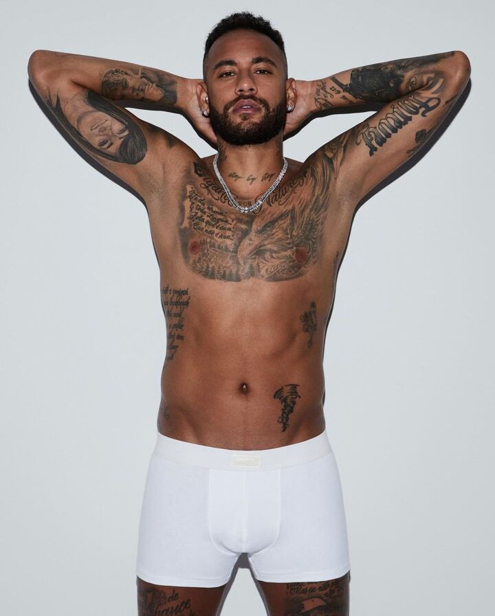 INJURED Neymar stripped to his boxers and showed off his tattoos in an advert for Kim Kardashian's SKIMS line.