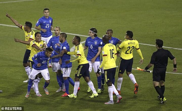 After the referee had blown the final whistle, Neymar was shown a red card for kicking the ball at Pablo Armero before aiming a headbutt at goalscorer Jeison Murillo.