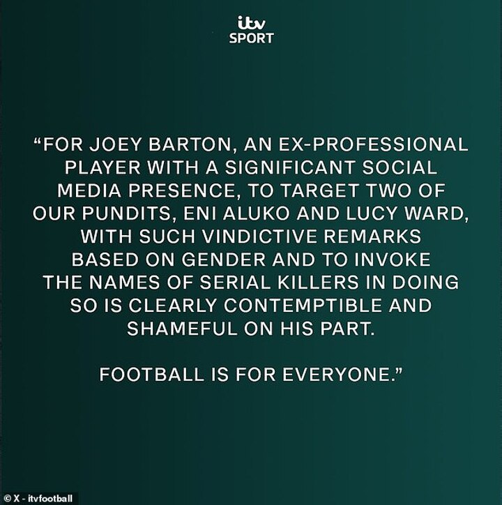 In a video message, Aluko reacted to Barton's rants, including one that targeted her and Lucy Ward when they appeared on ITV's coverage of the FA Cup third round tie between Crystal Palace and Everton.