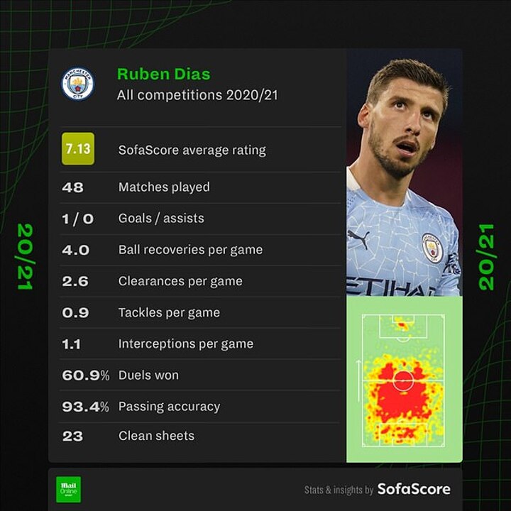 His rock solid partnership with John Stones proved key as Guardiola's men recovered from a disappointing 2019-20 campaign to win the Premier League title, with Dias keeping 14 clean sheets in 31 appearances so far.