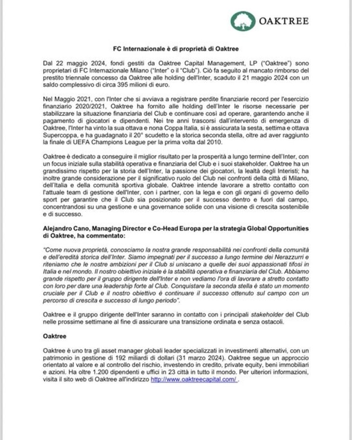 Oaktree and Inter's management team will be in contact with the Club's key stakeholders in the coming weeks to ensure an orderly and unhindered transition.