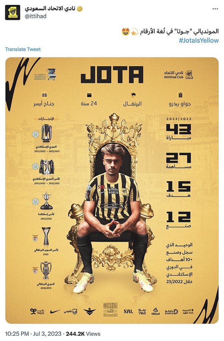 Jota joins recent signings including Real Madrid legend and Ballon d’Or winner Benzema and former Chelsea midfielder Kante in the Al-Ittihad squad, where Scot and former Hearts boss Ian Cathro is first-team coach.