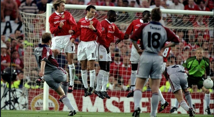 Bayern scored first after Manchester United's Danish back Ronny Johnsen fouled Bayern striker Carsten Jancker just outside United's penalty area. Right forward Mario Basler took the ensuing free kick, which swerved around the United wall and into the left corner of the net, giving Bayern a 1-0 lead in the 6th minute.