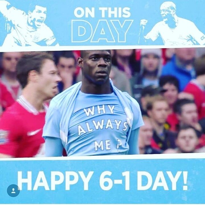 On the 7th anniversary of the iconic 6-1 victory at United, Balotelli took to Instagram to delight City fans all over again last year. He posted an image to Instagram with his 'Why Always Me?' slogan and accompanied it with the caption: "Don't ever forget this day Manchester United"