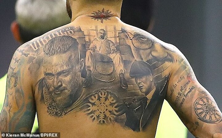 The Manchester City star has characters from his favourite TV shows Breaking Bad, Peaky Blinders and the Vikings inked on his back.