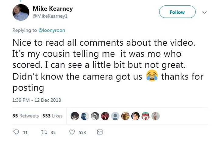 Kearney was clearly moved by the comments and responded later on Twitter, writing: 'Nice to read all the comments about the video. It's my cousin telling me it was mo who scored. I can see a little bit but not great. Didn't know the camera got us.'