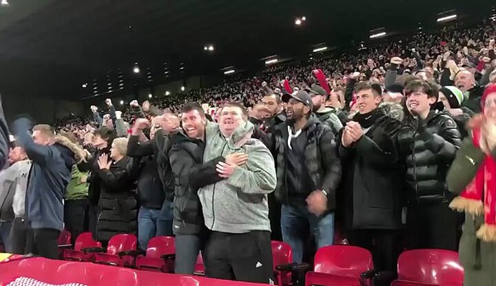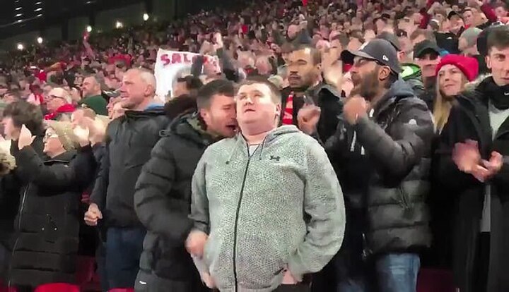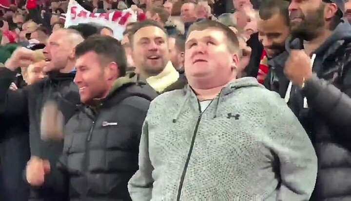 In the video, Liverpool supporters can be seen jumping up and down in pandemonium as they celebrate taking the lead before it focuses in on Mike Kearney.