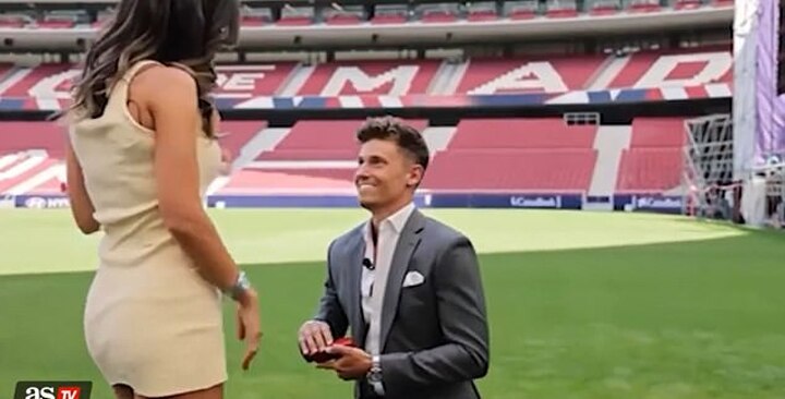 The 26-year-old Atletico Madrid midfielder popped the question to the brunette beauty, 25, on the Wanda Metropolitano pitch on Monday.
