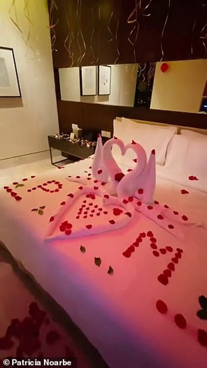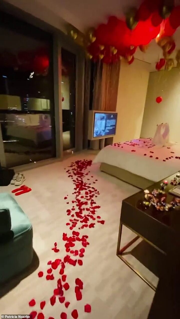 She also showed off the very romantic hotel room in Dubai the pair stayed in after the proposal, with a line of rose petals leading to their huge bed which was also adorned with petals in the shape of their initials.