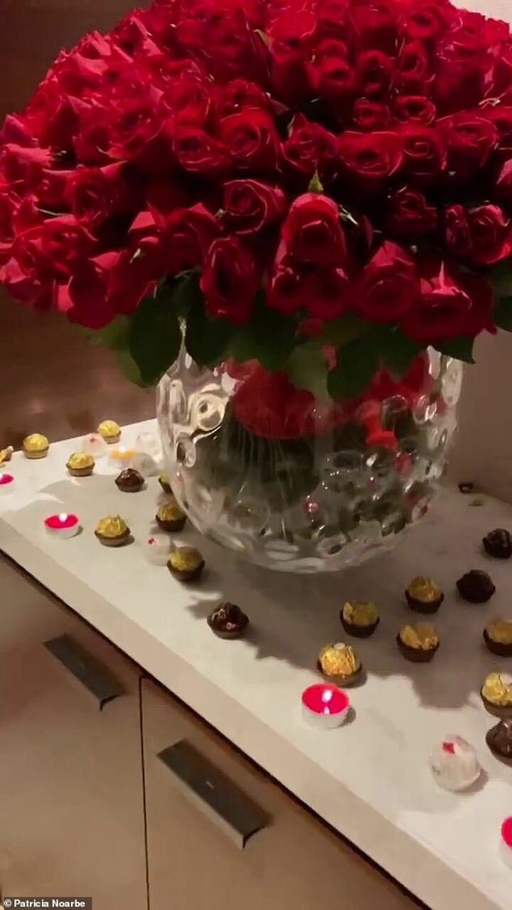 The bedroom also had dozens of red balloons hanging from the ceiling as well as a huge bath covered in more roses.