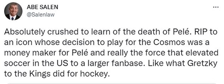'RIP to an icon whose decision to play for the Cosmos was a money maker for Pelé and really the force that elevated soccer in the US to a larger fanbase. Like what Wayne Gretzky to the Kings did for hockey.'