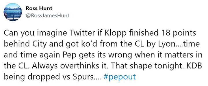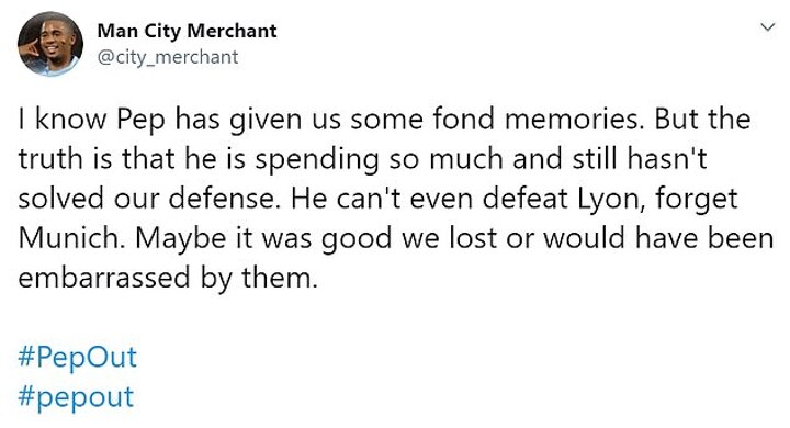 The loss means City have the League Cup triumph in February as their only trophy honour this season and the #PepOut hashtag was trending in the UK on Sunday morning.