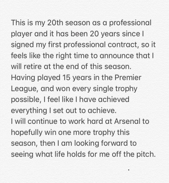 The 36-year-old joined Arsenal from London rivals Chelsea in 2015, and he will now bid Emirates Stadium farewell at the end of the season.