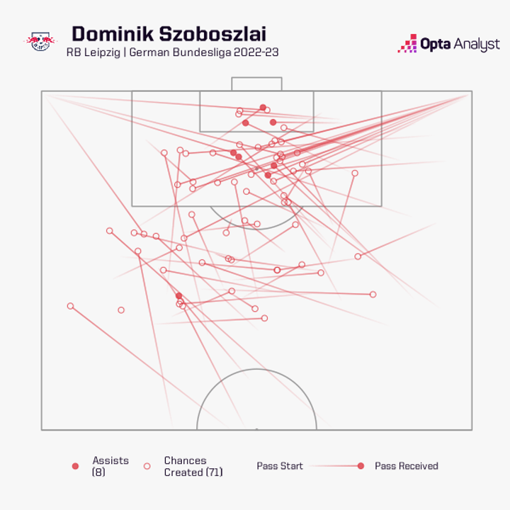 Reunited with his former coach at Salzburg, Szoboszlai managed to perform at a consistently high level and was directly involved in 14 of Leipzig’s league goals (6 goals, 8 assists), with only Bundesliga top scorer Nkunku involved in more for the club (20). No other Leipzig player created as many chances as Szoboszlai (71) – and since Rose took over in September 2022, only Borussia Mönchengladbach’s Jonas Hofmann laid on more opportunities (88) and had a higher expected assists value (9.9) than Szoboszalai (70 chances created, 8.5 expected assists) in the whole Bundesliga.