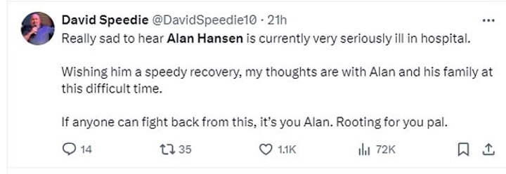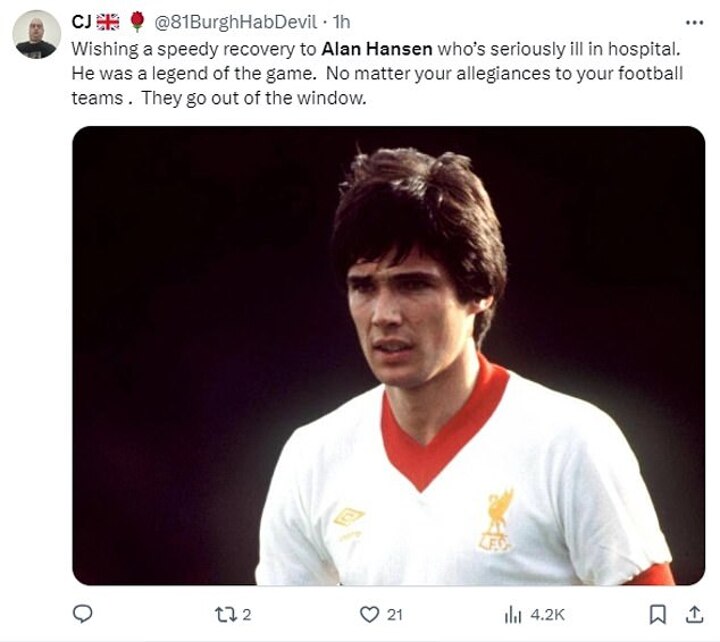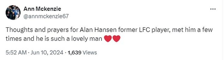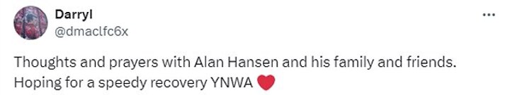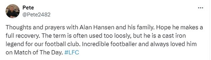 One fan posted: 'Really sad to hear Alan Hansen is currently very seriously ill in hospital. Wishing him a speedy recovery, my thoughts are with Alan and his family at this difficult time. If anyone can fight back from this, it's you Alan. Rooting for you pal.'
