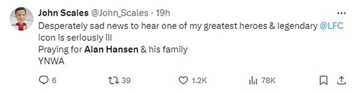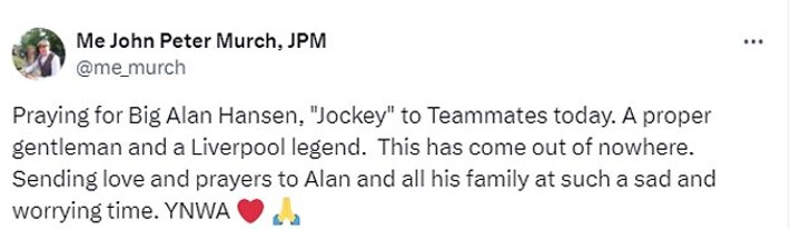 'All our thoughts as ex-LFC players are with Alan (Jocky) Hansen and his family. Let's hope he can pull through his illness. ynwa,' he wrote on X.