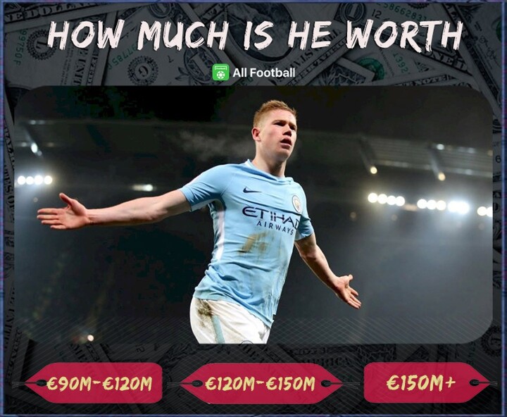 According to Transfermarkt, the current market value of Kevin De Bruyne is €150 million. Now we're leaving you the call.