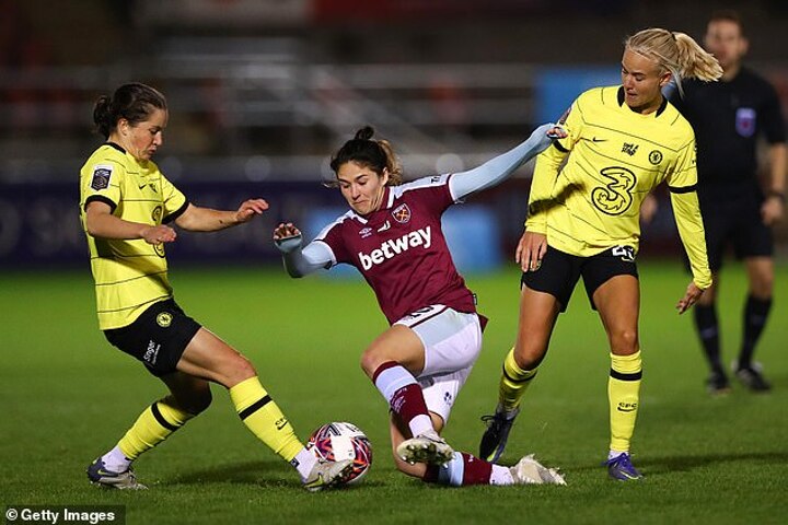 But three goals in eight second half minutes put Chelsea 3-1 ahead. First, Erin Cuthbert headed home Joanna Andersson’s cross before Harder got her second with a tap-in after Kirby’s shot was parried by Hammers’ goalkeeper Anna Leat.